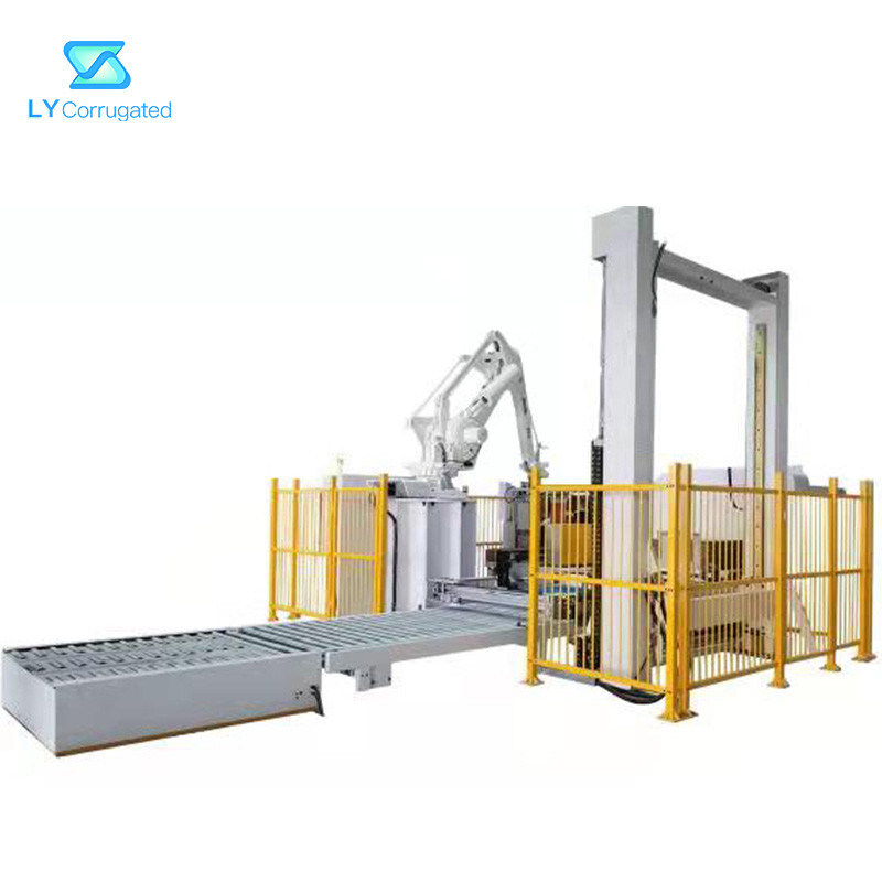 1, linha inteira incluir do padrão de sistema de Palletizer do robô: O auto transporte de rolo, empacota o dispositivo de posicionamento, braço do robô, auto compartimento de pálete, dispositivo de papel da loja da folha, auto pálete que espreme o dispositivo